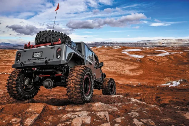 Up next Roxxie: A Jeep Wrangler Built for Adventure by Julie Heyer Published on July 23, 2024 Author Lindsey Fisher Photo Credit Motobilt Share article Facebook 0 Twitter 0 Mail 0 MotoBilt’s Masterpiece: A Jeep Gladiator Rubicon Like No Other A Fully-Outfitted Jeep Gladiator with Aluminum Body Panels and Armor Galore when the new Jeep Gladiator hit the market for 2020, it took the Jeep and light truck worlds by storm. Not only did the new truck offer a renewed way to adventure, but it also brought with it decades of Jeep truck history. But some were skeptical with regard to how it would perform from the get-go. After all, how well could an elongated four-door Jeep with a bed do off road? Luckily, it ended up doing pretty dang well on and off-road in applications from running to the hardware store to racing some of the toughest off-road races in the world. The Gladiator also gave overlanders and off-road enthusiasts another platform to build upon, while ushering in a new era of performance and aesthetic products for Jeep. One company that has focused hard on developing unique options for the Jeep Gladiator is MotoBilt of Ozark, Alabama. After one look at MotoBilt owner and CEO Dan DuBose’s own built-out 2022 3.0L EcoDiesel Jeep Gladiator Rubicon dubbed “AlumiBOB,” you’ll understand his dedication ! Subscribe to our weekly newsletter As you may remember, the original Jeep Gladiator came onto the market as a variant of the 1963 Wagoneer. Offered in both rear-wheel and 4-wheel-drive options right out of the gate, the truck progressed quickly with new engine options, bed sizes, and industry innovations like power-assisted brakes and power steering over the years. The Gladiator name was discontinued in 1971, but in its place came the J2000, J3000, and J4000 models. This line of trucks, though renamed and having the J3000 model dropped early on, remained part of Jeep’s lineup until 1987. The final Jeep truck model, which was built on the Jeep Cherokee platform, ran through 1992. For 27 model years, the Jeep truck remained MIA from the industry, except for a concept design released in 2005 that first garnered hope for the model to come back only to fizzle out as years went by with no further moves. But then in late 2018, Jeep caused an industry storm as it debuted the latest addition to its 2020 model-year lineup at the LA Auto Show—the next-generation Jeep Gladiator! Since the announcement that the new Jeep Gladiator would be hitting the scene in 2019, Dan and his team at MotoBilt have been in full research-and-development mode, which has led to nearly 150 custom products for the truck, including body armor, brackets, fuel cells, body panels, and even a modified bed. And what better way to show off all you’ve created for the truck, while continuing to research and develop more products, than by building your own impressive Gladiator Rubicon? Off-Road Capability Magnified Dan’s Gladiator is a 3.0L EcoDiesel Rubicon, which set him up nicely in regard to the truck’s off-road capabilities straight from the factory. But just like any good thing, there is always room for improvement! One such place on the Gladiator is the suspension. While the stock suspension on the Rubicon version of the Gladiator is fairly capable, and the best you can get from the Jeep factory floor, Dan knew he could greatly improve his truck’s capabilities with the addition of components like a Rock Krawler 4-1/2-inch Adventure-X “No Limits” suspension system, King 2-1/2-inch remote reservoir shocks, RockJock 4×4 Antirock sway bars front and rear, and Steer Smarts YETI XD track bars front and rear. He also opted to upgrade the steering system while he was at it, trading stock components for a PSC Big Bore XD hydraulic-assist steering box, and an all-aluminum Fusion 4×4 1-ton steering kit with a tie rod and drag link. To beef up the Gladiator for even more off-road fun, Dan added one-piece 1350 CV driveshafts from Adams Driveshaft and Off Road both front and rear, a Fusion 4×4 Dana 60 HP front axle, and a Fusion 4×4 GM 14-bolt rear axle—both with with 4-inch axle tubes. Both front and rear axles were then fitted with 40-spline axle shafts, ARB air lockers, and tall 4.88 gears, while the frontend was outfitted with locking hubs. If you’ve ever taken your built rig on any moderate to advanced off-road trails, you’ll recognize the importance of this. Planting the Gladiator to the ground are 20×10 Dirty Life Canyon Race beadlock wheels with a negative-38 offset, which puts the 15/43-20 Mickey Thompson Baja PRO XS tires well outside the truck’s modified wheel wells. All About That Diesel Being lighter in weight, as well as boasting better fuel economy in comparison to Jeep’s gas engine offering, the 3.0L turbocharged EcoDiesel in Dan’s truck is rated at 260hp with 442 lb-ft of torque at the stock level. But Dan was convinced he could improve upon these numbers by doing a massive engine build. He also wanted to keep the reliability of the factory diesel engine, so he opted to outfit the Jeep with two things—a Banks Power Derringer tuner and an iDash pedal commander. This tuner can add upwards of 80hp and 144 lb-ft of torque to the EcoDiesel, and features six power levels that are interchangeable on the fly, while the iDash pedal commander connects through the Jeep’s On-Board Diagnostics system to improve throttle sensitivity and reduce factory throttle delay. Talk about more fun! Backing the diesel engine is the Jeep’s factory 8-speed automatic transmission and Rubicon 4:1 transfer case. More Armor, Better Lines, and a Great All-Around Package Upgrading an off-road capable vehicle is more than just suspension and drivetrain deep. It also includes lighting improvements, cargo-stowage, body armor, and even body modifications—all of which Dan and his team at MotoBilt continue to develop components for. One of the first things you may notice on AlumiBOB is the shortened bed. For this effe
